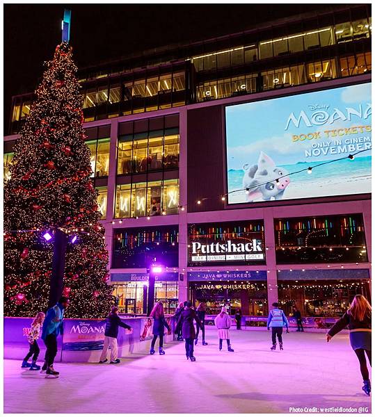 和巴特西發電站溜冰場一樣,Westfield溜冰場也是2022才啟用的的溜冰場,這裡有著全歐洲最高的聖誕樹,今年特別的是,與迪士尼《海洋奇緣 2》合作,提供獨特的節慶體驗,大洋洲的氛圍,與冬季仙境融為一體👍